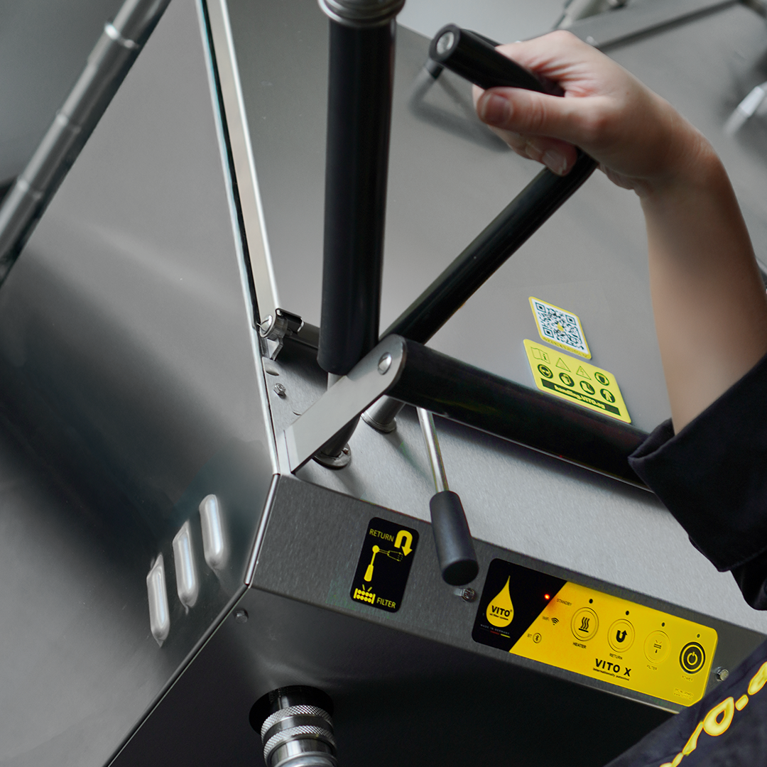 VITO XM filtra e pulisce l’olio in modo semplice, efficace, sicuro ed in modo del tutto igienico. Con l’apposita lancia VITO estrae l’olio dalla friggitrice, lo pulisce e lo filtra eliminando anche i residui carbonizzati.